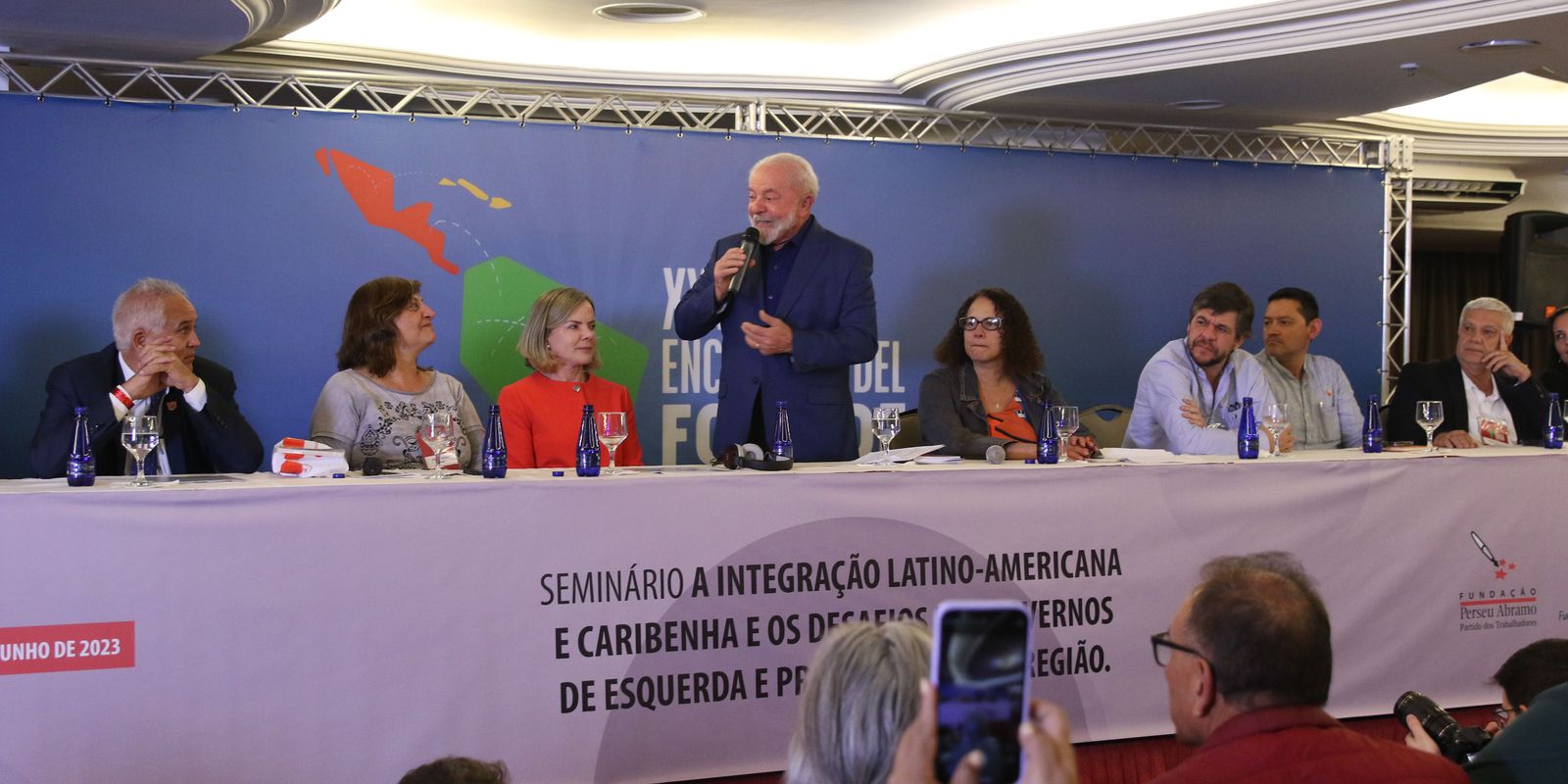 Para a deputada federal Gleisi Hoffmann (PT-PR), a realização do encontro é importante para combater o que chamou de “campanha de difamação” contra a articulação progressista latino-americana. Ela discursou na abertura do encontro e afirmou que “companheiros de boa fé” não concordavam com a realização do encontro no Brasil, com a presença de Lula.